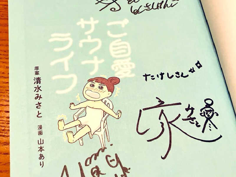 サウナにハマるきっかけをくれた万平さんに会えて幸せでした!入浴中はとくさしけんごさんの音楽とおしゃべりを聞きながらでサイコー!清水みさとさんともご挨拶できて感無量!!なんとお三方のサインもいただいちゃいました!