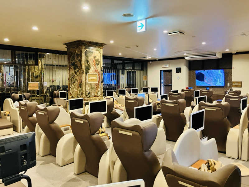 まずはミストサウナへ。頭上からミストが絶え間なく降り注ぐ、座席は一人づつ区切られていて快適、背中にはお湯が流れ、足元にも足湯がある。こんな形のミストサウナは初体験かも!新感覚で気持ちいいです。