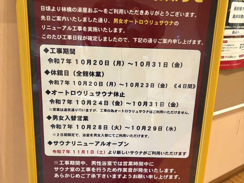 息子の文化祭や家族タイムをしっかり満喫したあと、庭の剪定でHPゼロ寸前のわたしに、神嫁からの「おぶー行ってきなよ!」という回復呪文。ありがたくご褒美サ活へゴーゴー♨️