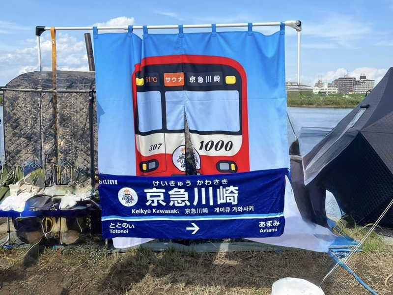 次は京急ブース。京急電鉄さんがオールバックアップのもと、サウナをオープン♪外にはイベント用に作ったという暖簾やタオルがあった。タオルは、鉄道ファンではないが、非売品だという事で、買えないけど正直すごく欲しかった!テントサウナに入ると、これが想像以上にアヂアヂ!ストーブは2台。小さいが、薪ストーブでセルフロウリュ可!温度計はないが、100℃は裕に超えている!そこにスタッフさんが入ってきて、1人ずつタオルで扇いでくれる。「京・急・線」の掛け声と共に3回いただきました!アヂーーー!スタッフさんは最初からずっと滝汗!この室温じゃそうなるよね!ありがとうございます。次は「NEL JAS」テントサウナ。こちらは、サウナ専用保水液のブース。森林の香りがするジェルを塗るとサ室でもしっかり香りから整う。その香りのロウリュができるらしい。中に入ると意外と広く、ストーブは1台だが一段高くなってるから上の方はアチアチ!ここではじっくり入る。ロウリュすると香りも○♪しっかり蒸される。そんなこんなで時間もあとわずか。次は「アウフグースサウナ」で豹華ももさんのアウフグース。天井が低いサ室の中でもしっかりタオルの熱波を堪能しました!
