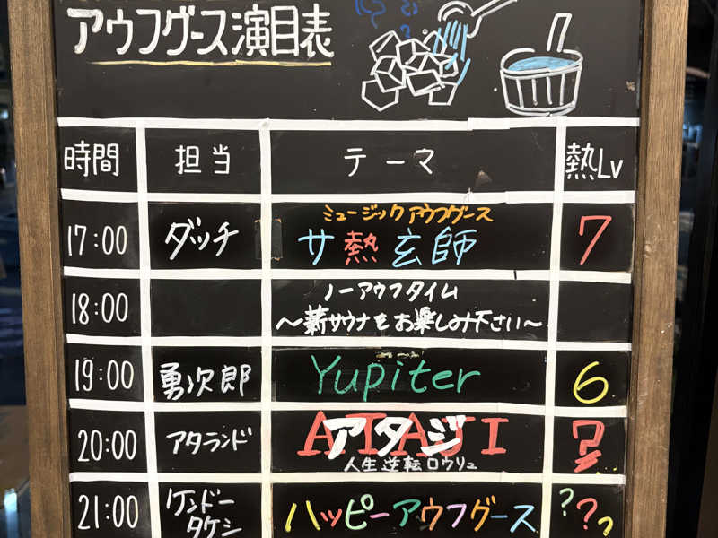 明け番…巡視対応…議事録&秋交まとめ…しっかり残業。それでも、それが終われば、サウナチャンス!どうしようかな?と悩む隙もなく、今日は薪サウナでしっかり整えたい!むしろ、毎サイキタイ!しかも越谷の。行くしかないでしょ!浅草から東武線に乗って30分。越谷駅からまた少し歩く。17時からのアウフグースに合わせて入る♪すぐに時間だから、さっさと清めて…さてサ室へGO!