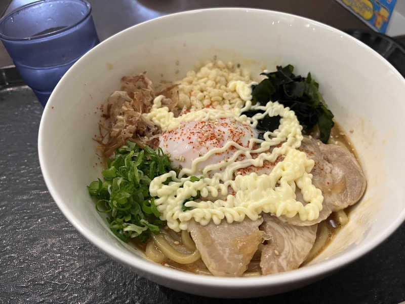 卵かけ極太麺(大盛り)を食べ、腹パン💦