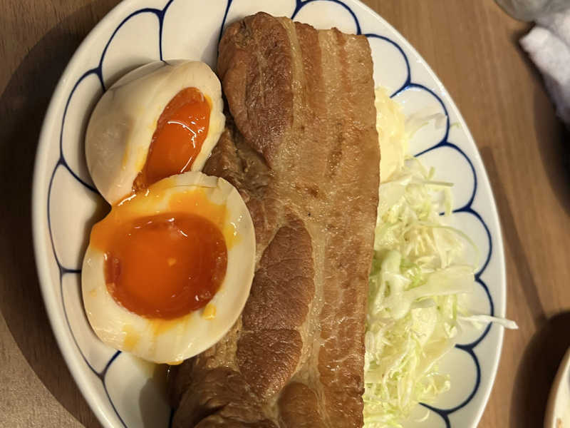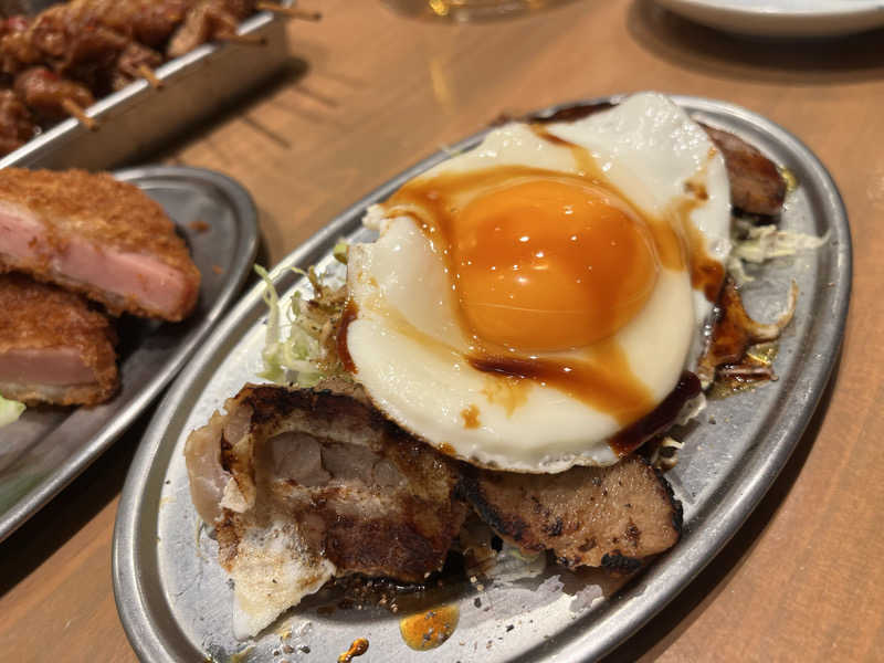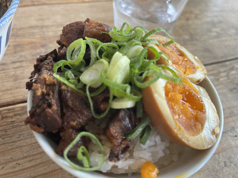 シメは館内で豚丼、生卵キムチを添えて…。
