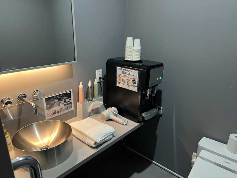 サウナハットかけ、氷のサービス、選べるシャンプー類、ダラダラスペースの近くにもウォーターサーバー