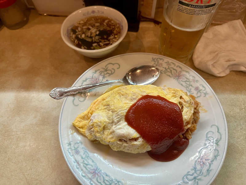 夜限定メニュー。しっかりケチャップで炒めた町中華のオムライスって感じ美味い!