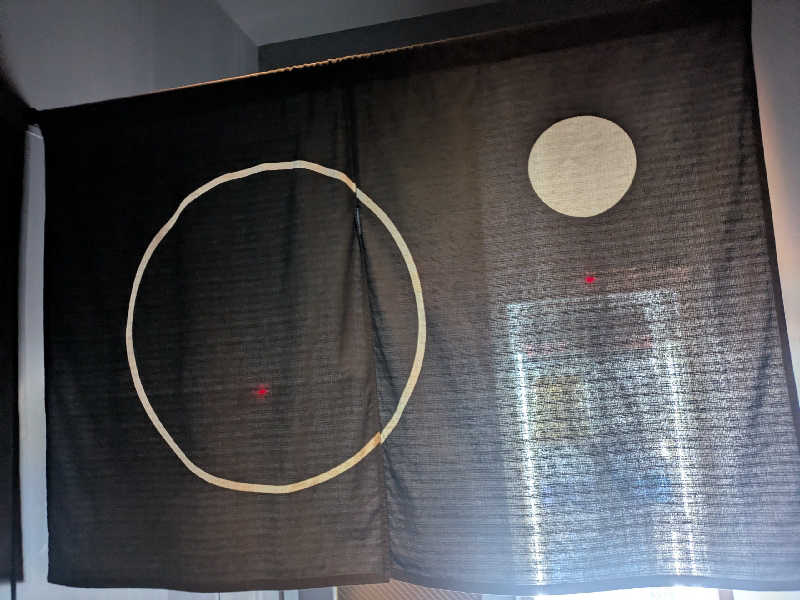そして真ん中に階段があり、そこを上がると個室サウナと、一階を望める回廊のような形で、畳の休憩スペースが。手前の壁に向けて、アバンギャルドなアニメ映像が東映されていました。