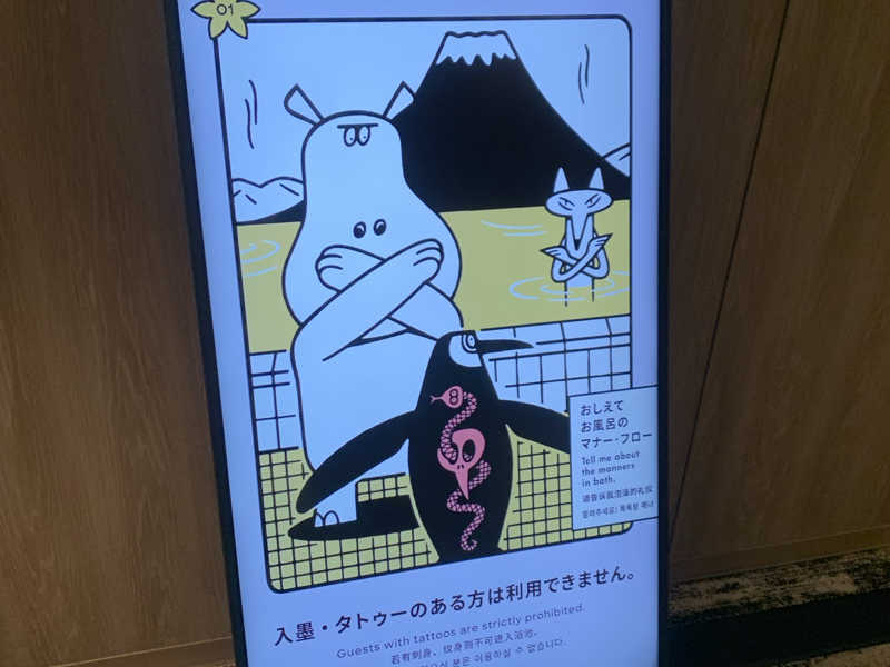 すごくいい銭湯で気持ちよく使いたいしマナーはとても大事だと思いちゃんとしてる人たちもいるのに体にお絵描きをしてエライ気になってる人種(もちろん良い方たちもいます、ごく一部です)のマナーもクソもない使い方で気分悪くなる人もいることすら気づいてなく悪びれることもないのが可哀想で残念でなりません。