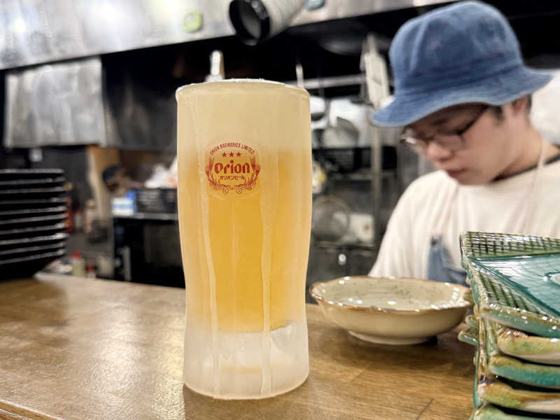 サウナ後のほてった身体にぴったり。オリオンビールで一気流し込む。