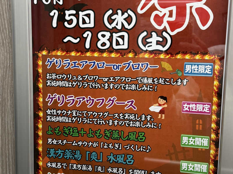 今日のゲストはクロウゼンの野獣ヒロキ氏。1、2セット目はドア開けたままのアウフグースでサ室に長く居ることができて良かったし、20時の回は歓声が上がってた、そして技もキマりまくってた。
