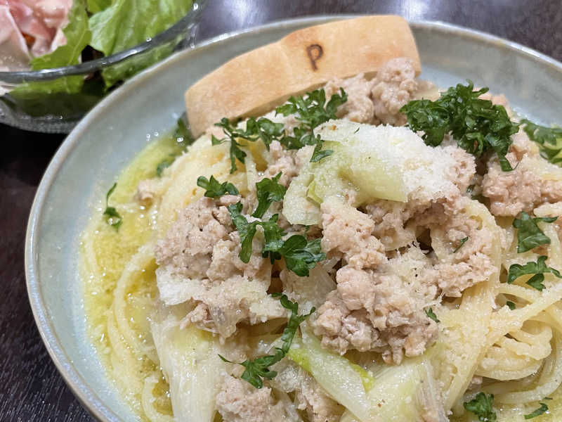 鶏ひき肉、白ネギ、チーズのアーリオ・オーリオとサラダ。