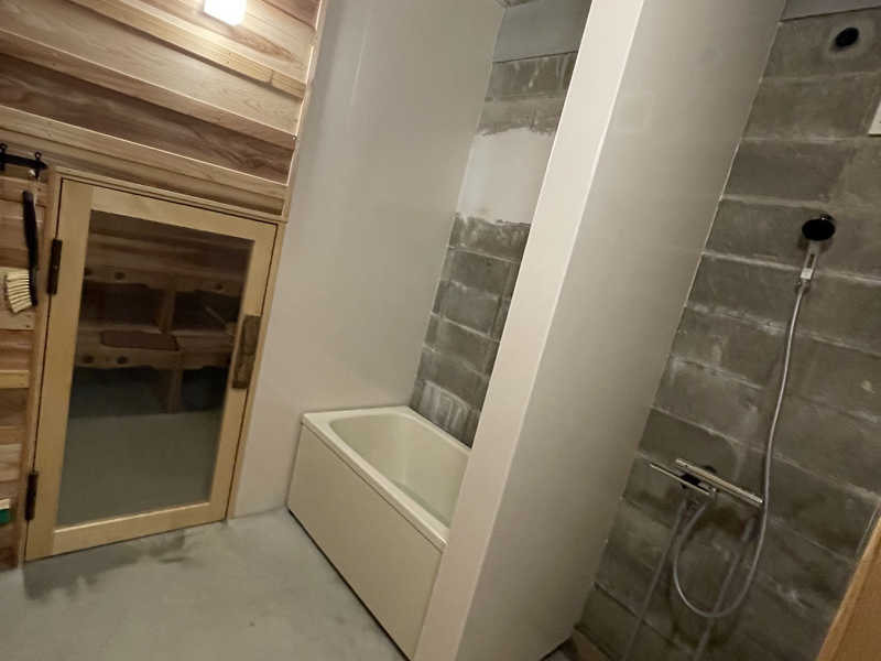 形はサウナと一緒でホールケーキを4つに割った内の1つみたいな形で、深さはちょい深めの肩までしっかり浸かる深さです。広さは3人程度入れる広さです。