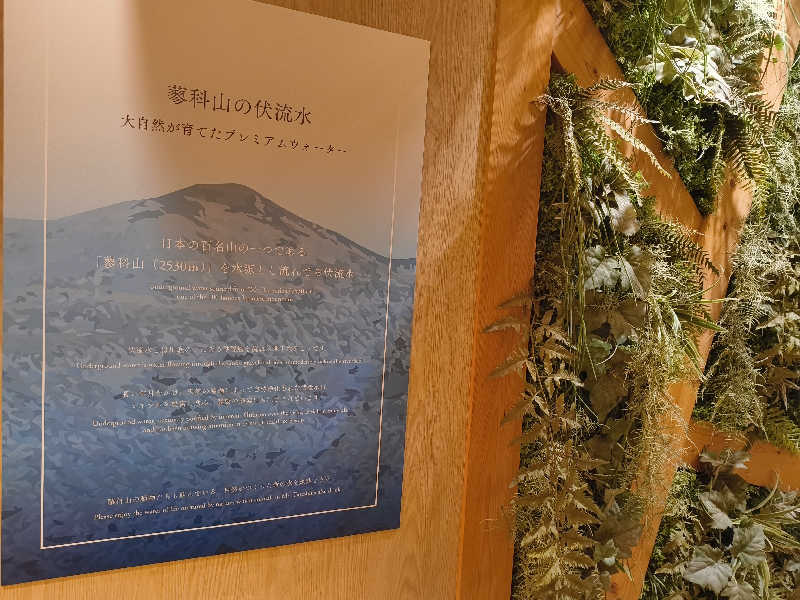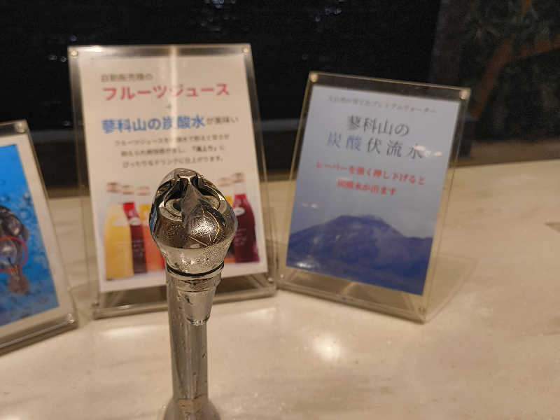 浴室手前のロビーに無料の蓼科山伏流水、炭酸水が飲めるサービス、ごろ寝スペース、テラス有り。