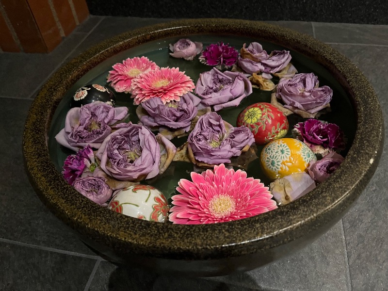 時間になるとヨーロッパぽい曲と共に天井の六角形の反熱板の隙間からシャワーの様に投入😅ノズルからも噴射あり結構ぶっかけ仕様。アロマはローズ🌹系かな。結構香ります。ただ湿度感は高いけどアチアチ感は無くて心地よい感じ。温度計では90℃に満たないですがしっかりアツアツでメリハリはあるので結構良かったです☺️