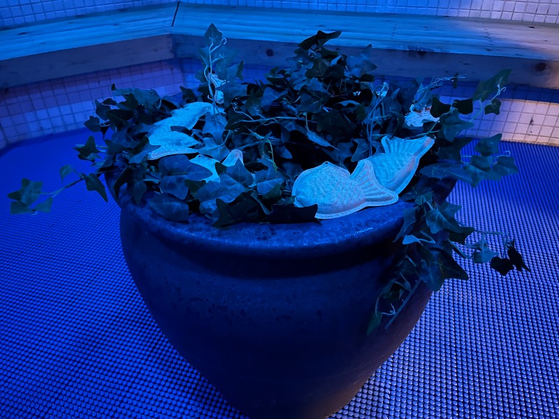 少し深めの足湯浴槽にL字型座席の頑張って4.5名定員規模。熱源は蒸気ボイラーのエロフィンヒーター。背面からのお湯の投入やアチアチ水滴💧も落ちてきて結構熱め。座ると丁度良い感じ。もちろんスチームサウナなので好みは分かれるけどジワジワ系サウナが好きな方なら是非入ってほしいサウナです。