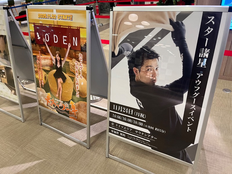 サウナシアターは3箇所から入れ、室内はかなり広くて3方向に4段座席があり140名収納との事😳こりゃスゴイ規模。テレビもあり巨大ですが来訪時は調子悪め。