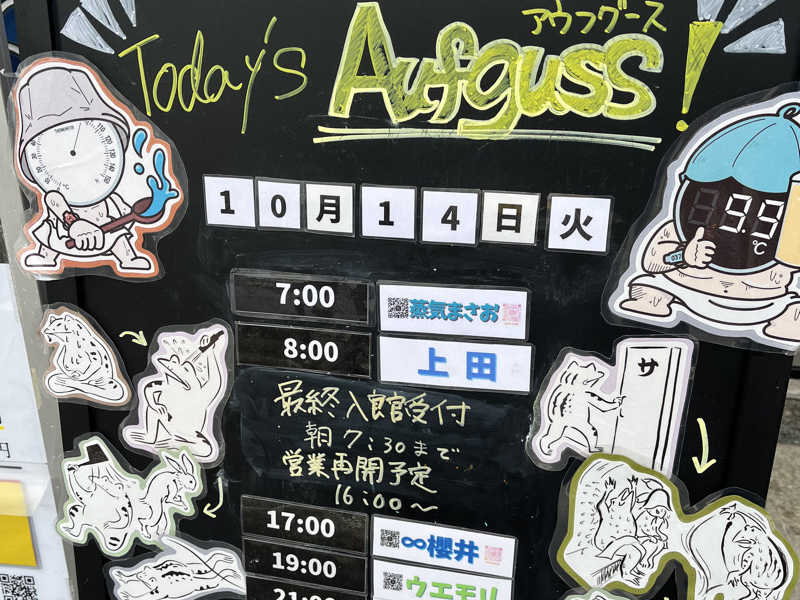 21時タクトさんアウフグースのたぶん3セットから参加。キレッキレのタオル技。サ室内気持ち明るく、タクトさんがお客さんの反応見ながらアウフしてる様子も見られたり。緊急追加の4セット目はアツアツロウリュ。終了後、サ室に残ってたらドラクエ勢と思しき5人組が「やべえ」「やべえ」と口々に言ってるのが印象的。