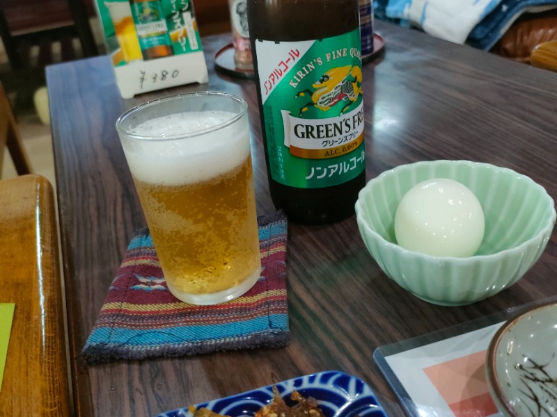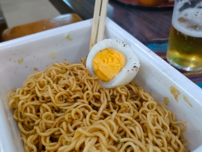 上がって、リクライニングでノンアルビール(ツマミ付き)、作ってもらうペヤングに、むいてもらったゆで卵🥚をトッピング
