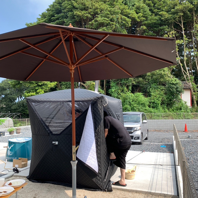 生憎の天候のため、サウナハットで雨除けをし外気浴