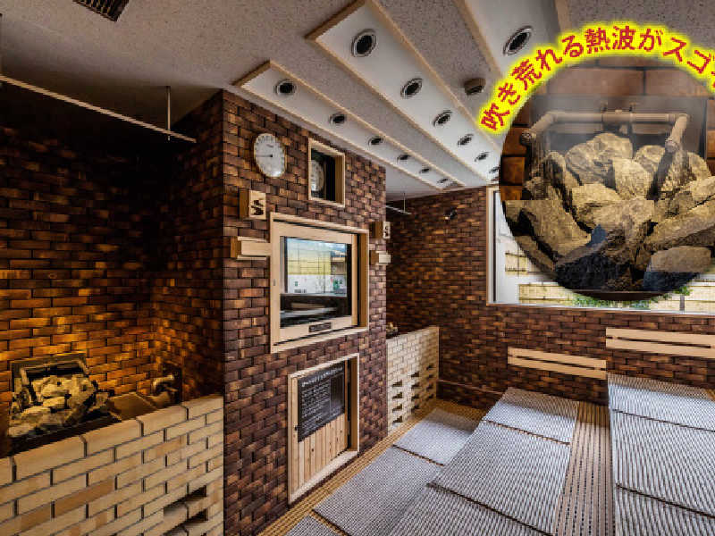 16人定員2段で、奥におっきいストーブ♡15分おきにオートロウリュあって温度と湿度が保たれてて、いつ入ってもコンディション◎