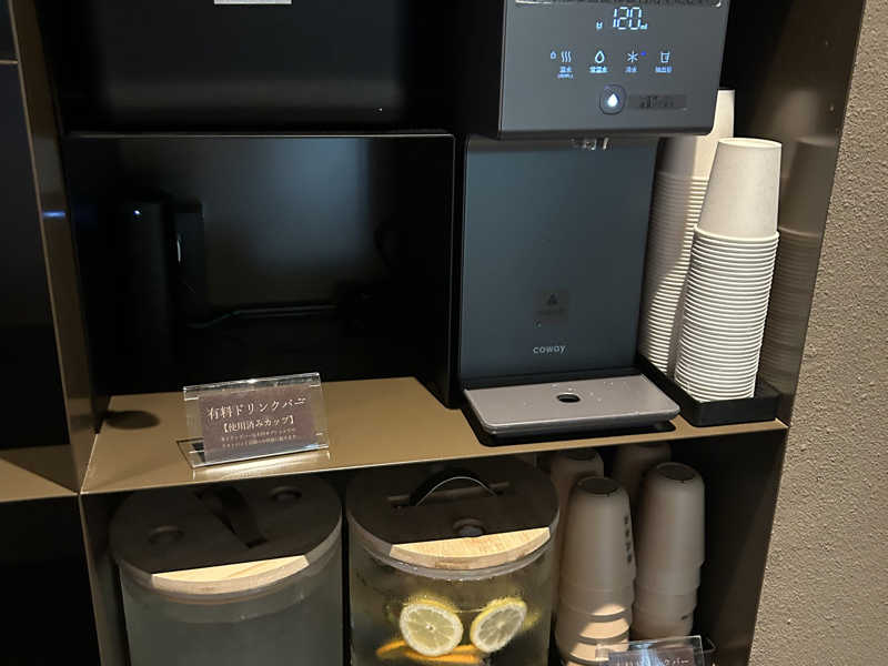 シャントリはZIRA、シャワーヘッドはReFa、メイク落としあり。ドリンククーラーは入り口付近と休憩スペースの2箇所。荷物置きの棚は、お洒落で一人一人スペース分かれてるのと、お風呂やシャワーから離れてるから濡れないのと、棚数しっかりあるのと…もう配慮が💯あとハットかけもある。