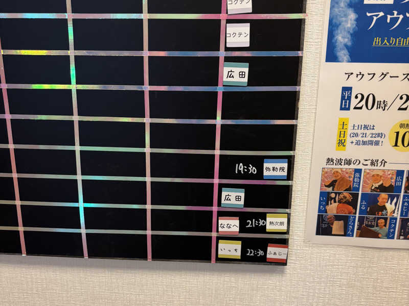 元気の出る熱波という事でイノキ、ガッツだぜ、ドリフのラインナップ。実は関東遠征の最初の施設が湯花楽だったらしい。そしてサ室は大盛り上がりw 最後に「待機組がいるから熱くするぞ〜」とちょい痛くらいまで熱くしてくれて満足w 終了後は一番端っこで休んでいたがそこまで力強いクールスイングを届けてくれてありがとうwww