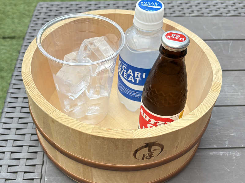 サ室は5人まで利用可。103度だったけど長くいられる感じ。利用者ほとんどなく、貸切ソロサウナ状態。テレビもないので無心で入れる!出てすぐ右に壺の水風呂。汗流す用の水シャワーあり。源泉掛け流しの水なので柔らかくて気持ちが良い👍入りすぎちゃうくらい。源泉だから季節で多少温度が変わるみたい。イスも多め。空と鳥の声聞きながら調えます。