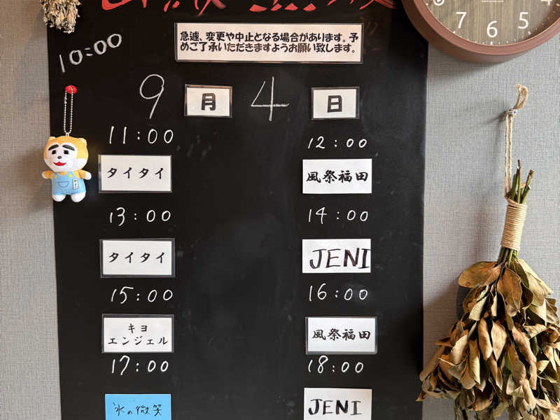 12:00から初めてのJENIさんのアウフグース🔥気合い入れて3段目に着席🙏🏻ローズマリーからのコーヒーの香り☕︎なかなか熱くしてくれてちょっとビビる💦男気ジャンケン大会が始まり、勝った皆さんは10発の熱波を浴びて、負けた方は氷を貰えるオモロイシステム✨最後の私は負けて氷をサウナハットに沢山入れてもらい、最後のロウリュに挑むが半端じゃ無い量をぶっ込んでくれたので2段目に逃走w激熱熱波でぶっ飛んだところで水風呂タイム👍🏻皆さん外気浴に行ったので水風呂のデカ桶独り占めしてたら水風呂入ったままアロマ水を頭にかけてくれて、スッゴイ気持ち良かった🔥これは凄すぎる❤️🔥❤️🔥