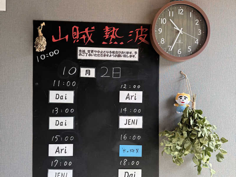 2週間ぶりの山賊サウナ🔥まさかの駐車場満車で空くのを待って1時間ほど小田原ドライビン👍🏻12:45インで13:00から福田さんのアウフグース🔥早雲山で塩サウナ🔥14:00からタイタイさんのアウフグースでガッツリ整いマックスなヨロシゲでした🔥🔥🔥