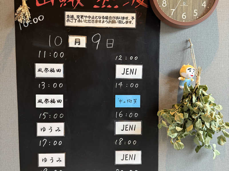 13:00から風祭福田さんのアウフグース🔥お香の香りで癒されて黒豆の香ばしい香りも気持ち良かった🔥タオルの妙技を味わいながらのクロモジも気持ち良い🔥最後はおかわり付きの山賊ロウリュ🔥🔥激熱熱波でこれまた超絶気持ち良かった✨水風呂で整った所で風祭福田さんの内気浴ターイム👍🏻前回受けて気持ち良かったから、またこのチャンスが来て嬉しげ👍🏻丁度良い風を扇いでくれて森を感じながら気持ち良く整えさせてもらいました👍🏻⭐️