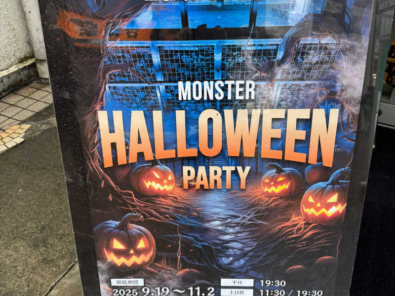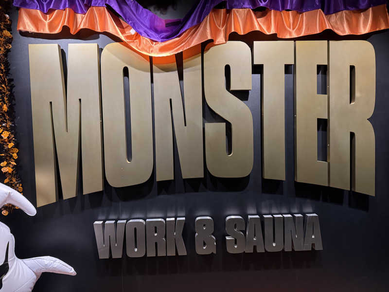 一言:行ってきましたよ、MONSTER WORK & SAUNA! 今日は熱波師みーちゃんと三田のえさんのアウフグースがあるということで初めてMONSTER参戦!13:00に到着。HALLOWEEN PARTYということで恐る恐る入る。シャワーを浴びてサ室へ。巨大なサ室は5段で100人ほど入る広さ。中央にオートロウリュのある巨大なストーブがあり、両側にもストーブ。オートロウリュが始まると最上段はかなり熱い。水風呂は14℃とちょうど良い温度。内気浴スペースは静かで暗く落ち着ける。