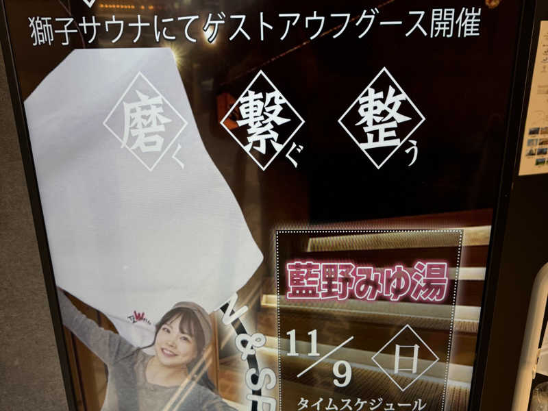 16:00から藍野みゆ湯さんのアウフグース①。15分前からいきなり整列。少し出遅れて5番目だったけど2段目真ん中をゲット。今日も笑顔で元気いっぱい!シティーポップの曲に合わせてタオルを振る。パワフルな熱波でしっかり蒸されました。アウフグース後にはクールスイングも。かわいいしホスピタリティも高いし最高でした💕18:00、20:00、22:00と4回あるのでこの後も癒されます♪