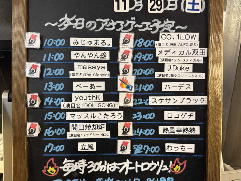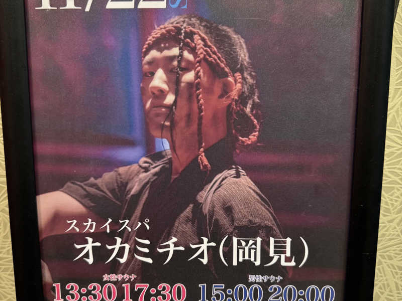 そして20:00から今日のメイン、オカミチオさんのスペシャルアウフグース。2段目中央をゲット。先ずはSNS用の写真撮影。皆んなでゆいるのロゴを模したポーズ。いい夫婦の日ということで落ち着いた曲を使って優雅にタオルを振っていく。2曲目から一転、パワフルなアウフグース!最高レベルのテクニックでサウナーを魅了する。鼻血を流しながら格闘家のような迫力でサウナーを煽る!温度もどんどん上昇しサ室全体が最高に盛り上がって終了。今まで受けたアウフグースの中でも最高レベルでした!またどこかでお会いしたいです♪
