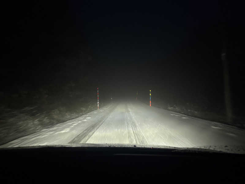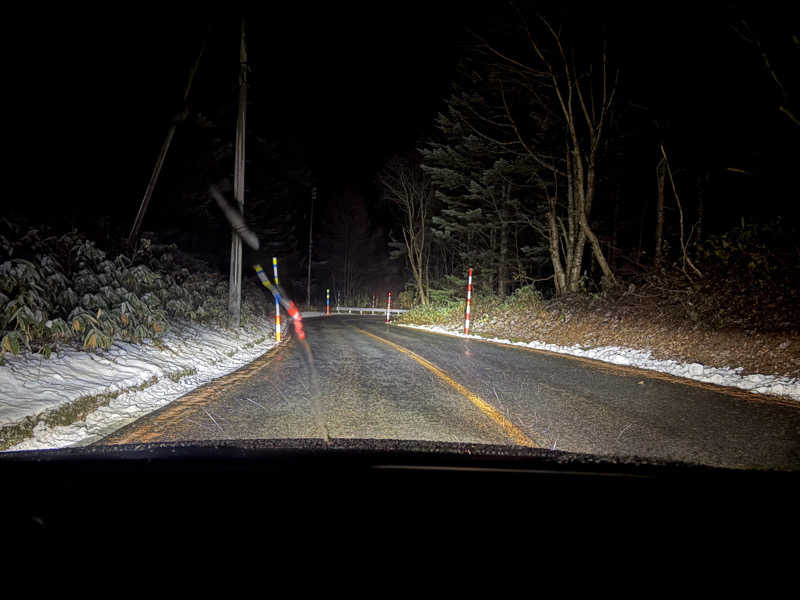 道路状況、路面に雪はなし。路肩にはあり。県道を左折して最終コーナー?辺りは解けていましたが少しあったかと思います。ただ、夜降り続くようですと積もる可能性もあるかもしれません。
