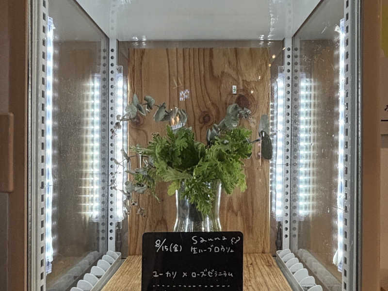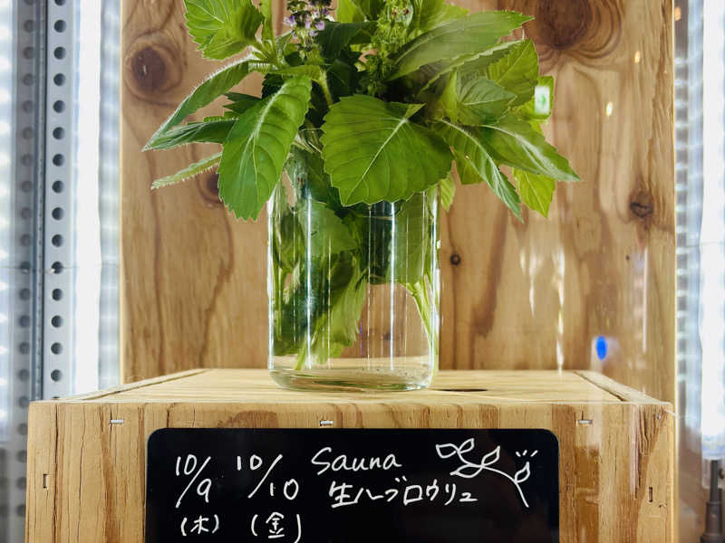 昼食での中休み後にサ室に入った14時頃に、ロウリュ上のハーブがフレッシュなものに取り替えられた。