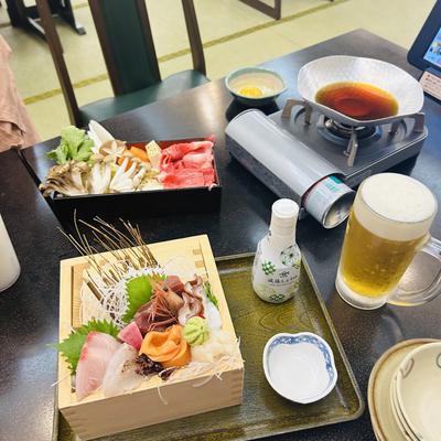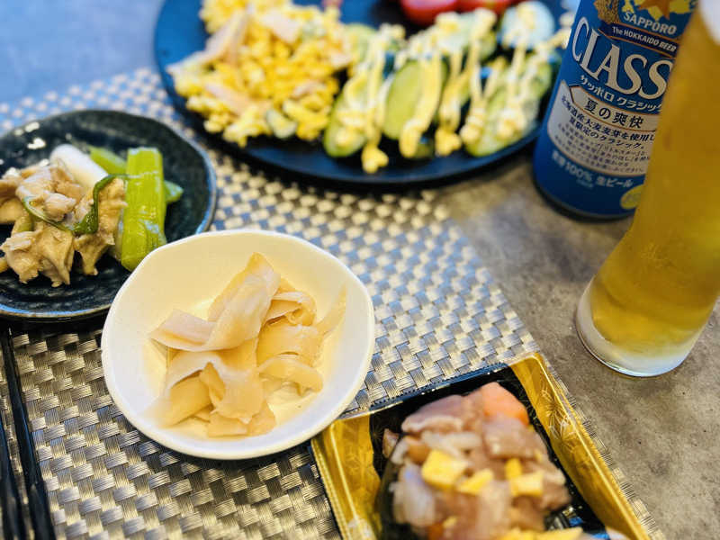 北海市場で調達したうなぎ寿司と生イカの他、焼きそば作ってたこ焼きチンしてビール🍺