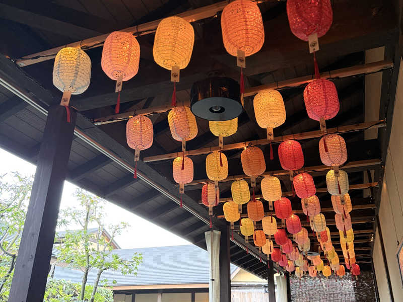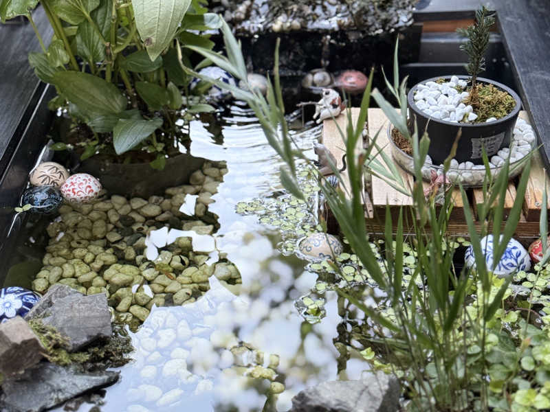 廊下の天井の提灯やお庭のビオトープなどいろいろ癒されました