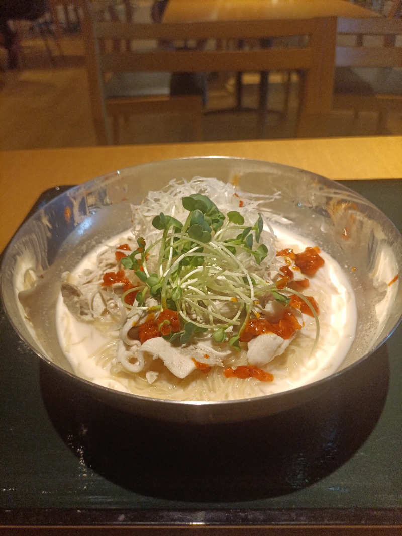 夜勤明けの久しぶりの朝一 サウナ+水風呂=あまみ この辺で一番あまみが出るとおもう😆 外気浴はないがオススメの施設 食事の時、左のカウンター席で🍺飲んでる👩の人がめちゃくちゃ見てくる😓 独り言も言ってるし怖かった🥲 ドキドキしながらの豚しゃぶ豆乳冷麺 美味しかった😆