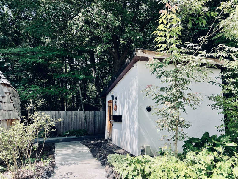 森の中にぽつんと佇む白いサウナ小屋は、まさに北欧トリップ。