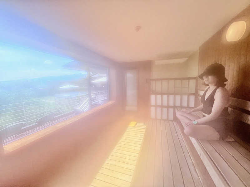 サウナは水着着用で男女共用。大きな窓からは明るい光が差し込み、遠くの山並みを眺めながらじっくり汗をかけます。