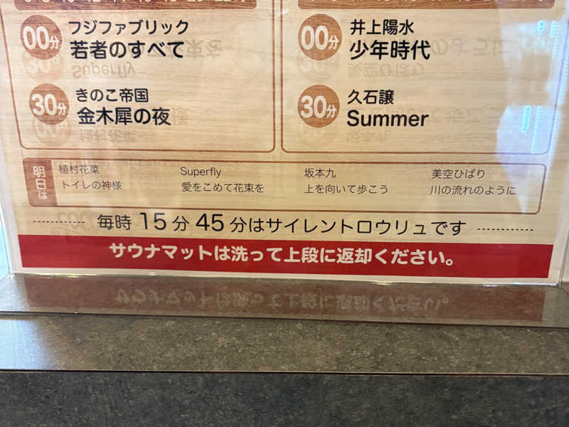 ただサウナ別料金なのにタダ乗りするやつが多いのか、塩サウナ入ってる時に「札バン見せてください」とスタッフさんに声かけられ。腕出したら、「そうではなくて、番号見せてください」と言われ、イラっとした。そもそもこの札バンドがヘアゴムにプラスチック板ついてるだけで、付けてると腕に当たって熱くて邪魔くさい。ちゃんと見えるところに付けなきゃなーと思ってちゃんと付けてたけど、なんでそんな偉そうにいうんだろ。タダ乗りするやつが1番よくないんだろうけど。安いし、綺麗だし、また来ると思うけど、今日はなんだかなーって感じでした。