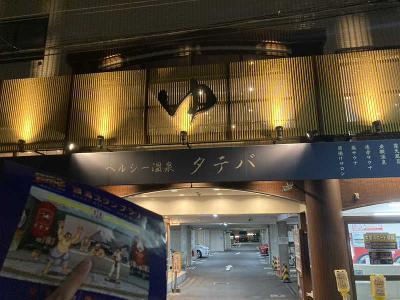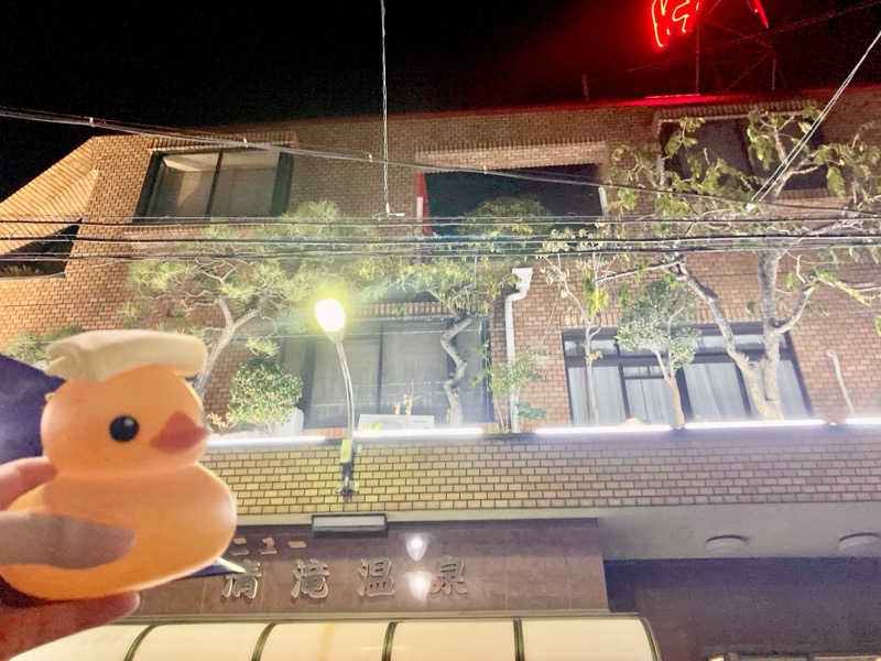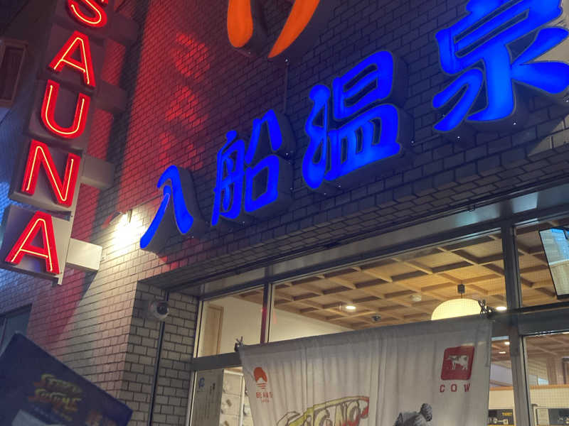 ・水風呂に滝のあるサウナが大好きなので伺いました。闇夜に浮かぶ赤い「ゆ」のネオンサインが素敵!2階には植木が?