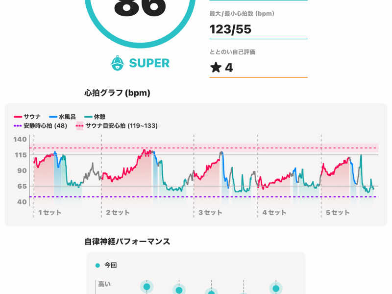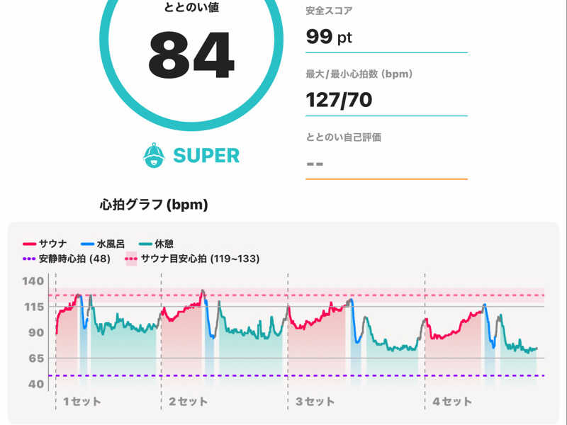 気づいたら5分くらいすぐに経過してた。90℃よりも少し低い温度キープされてて、セルフロウリュのタイミングがなかった。とはいえいい感じ。