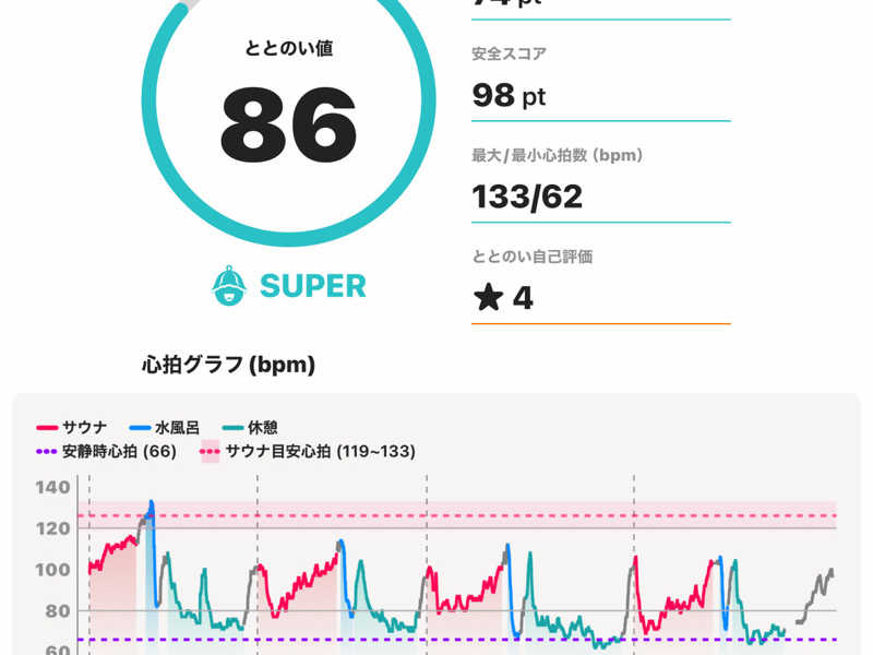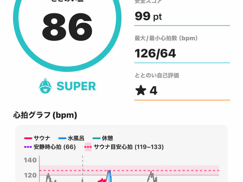 シャワーで身を清めて、95℃のサウナへ。心拍上がるぜー
