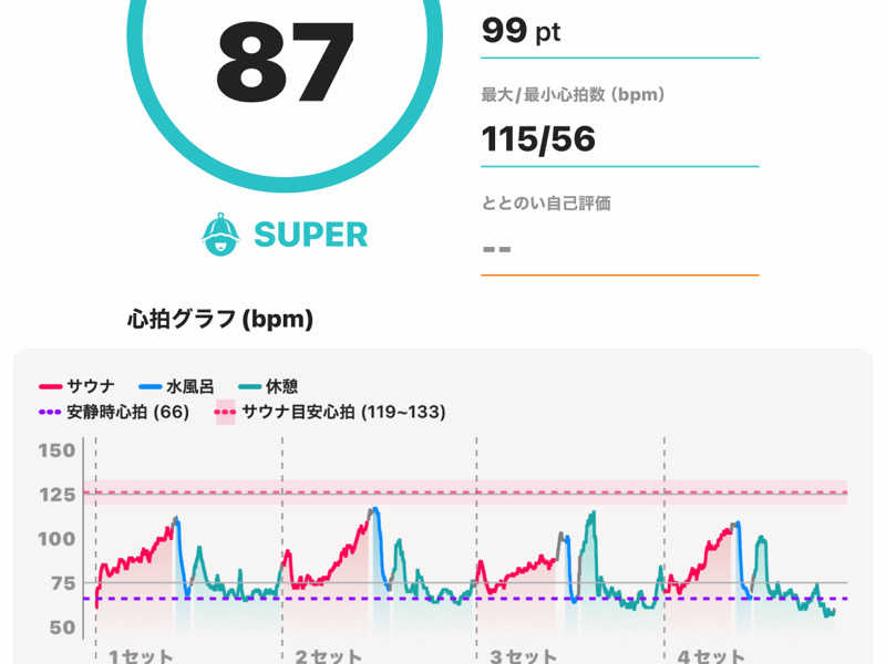 なかなか心拍数があがらないなー。サウナ室内80℃。