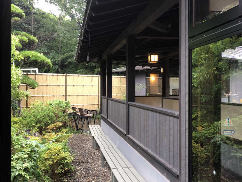 ココの喫煙所、中庭になっていて、料亭のような建物を眺めながらくつろげる。
