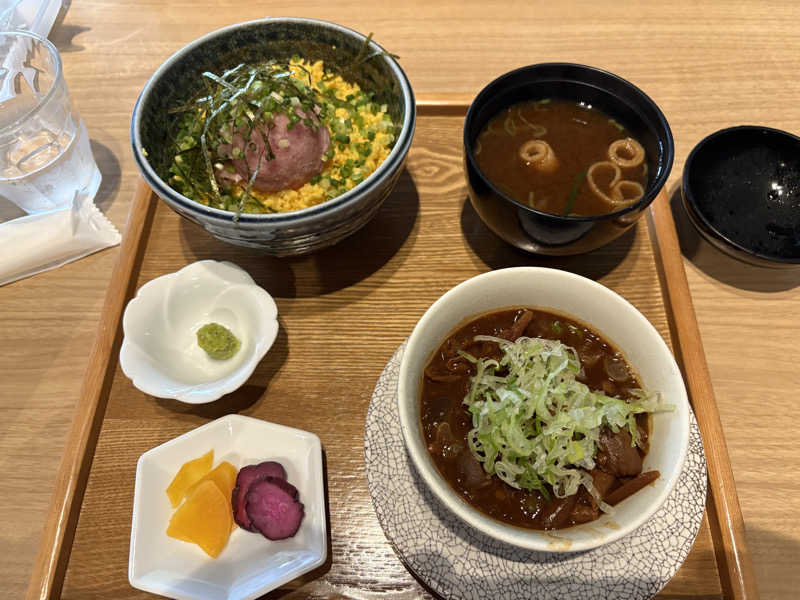 ねぎとろ丼にはお味噌汁と漬物がついてきます。どて煮は単品です。どちらも美味!