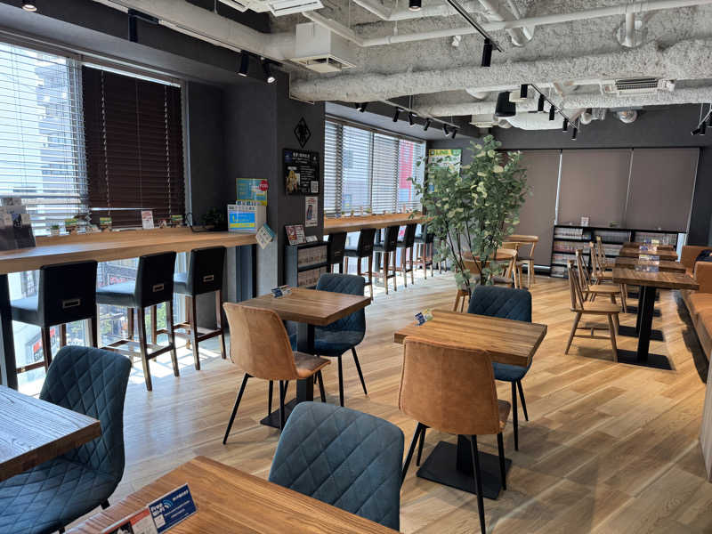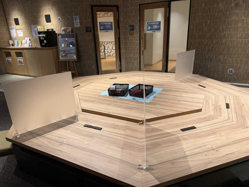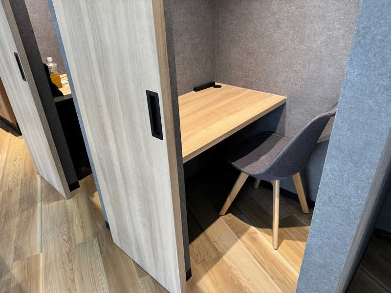 大人気サウナのかるまる。コワーキングスペースはパーテーションで分けられているデスクが10台程度。コワーキングスペース以外にもリラクゼーションスペースのデスクでもお仕事できます。