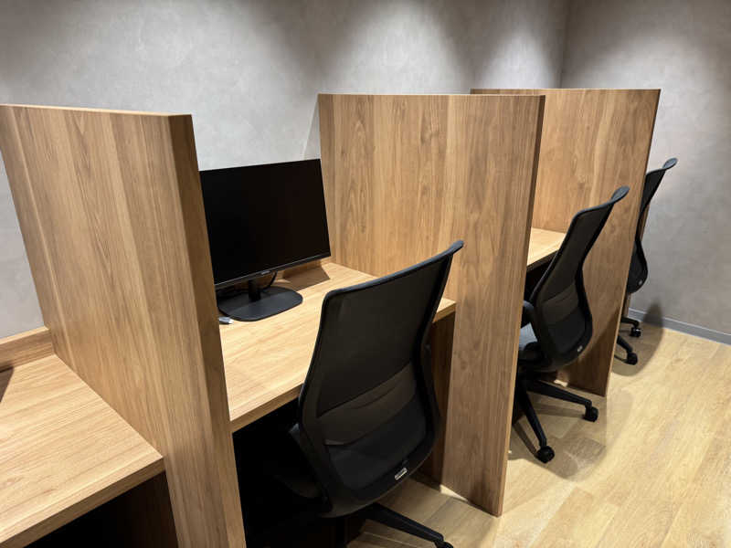 パーテーションで区切られた1人用のデスクが4台ぐらいと2人用のデスクが3台ぐらいありました。また有料のボックス席も1台。他にもリラクゼーションエリアにもデスクがあり、そちらでもお仕事できそうでした。