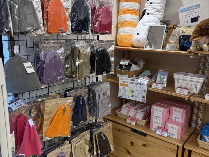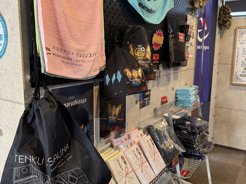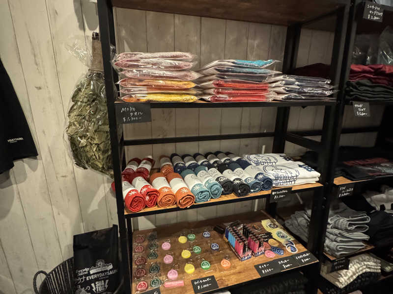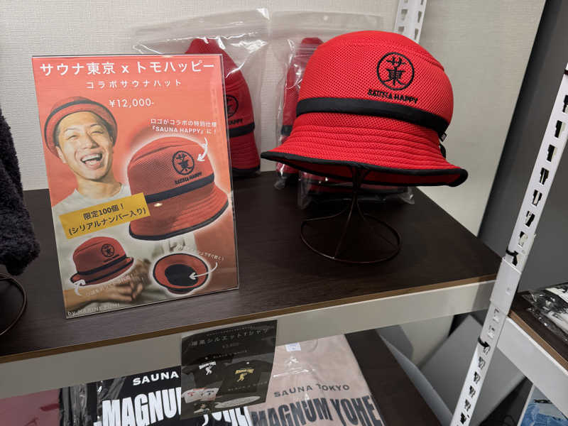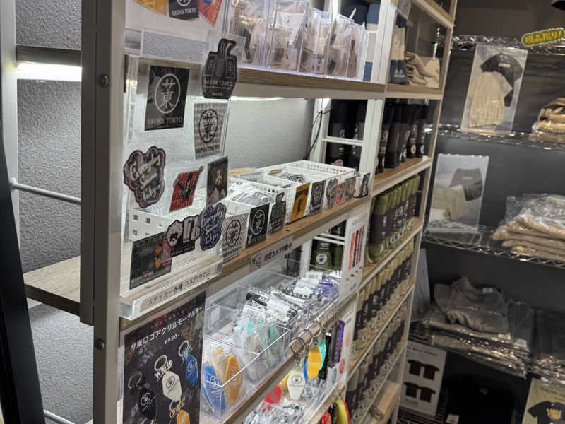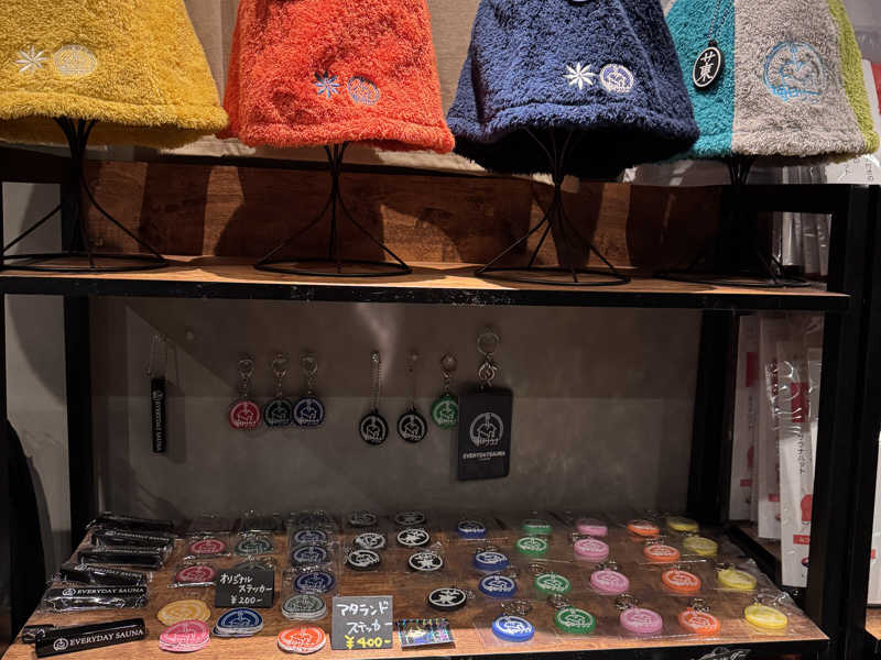 精算後はじっくりとトモハッピーさんコラボのサウナハットやステッカー、入荷されたばかりの限定ライターなどのグッズを眺めたり買ったり。