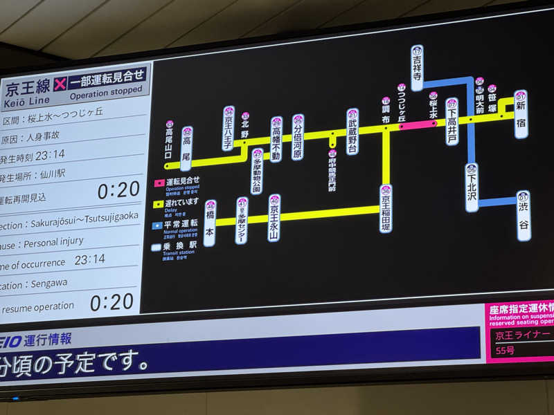 その後、京王線の事故に巻き込まれ1時間半電車が動かず振替輸送もなく、終電を逃し、新宿で始発まで強制的に過ごすハメになったのである。